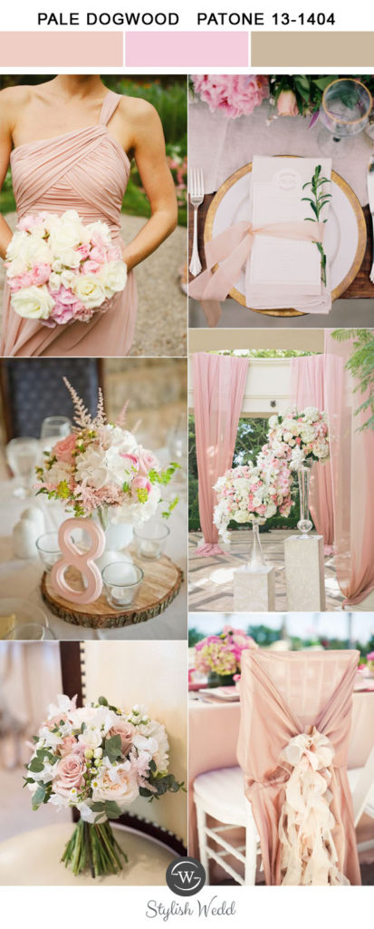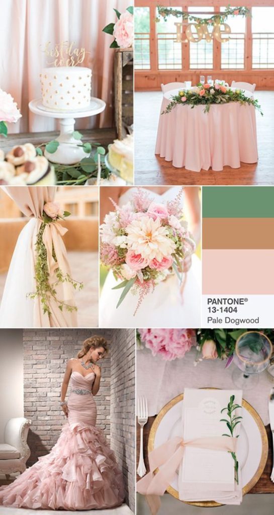 Pale dogwood – piękny, delikatny, lekko przybrudzony róż. Jeden z najbardziej neutralnych i najspokojniejszych kolorów w tym zestawieniu. Świetnie sprawdzi się jako kolor sukni ślubnej, gdy przyszła Panna Młoda chciałaby zrezygnować z klasycznej bieli. Idealny jako tło innych barw. Łączymy go z innymi zgaszonymi kolorami zieleni i brązu.