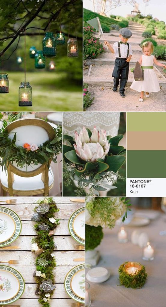 Pozostałe kolory, są podobnie jak Kale kolorami lekko przygaszonymi. Ostatnio bardzo popularnymi stały się śluby w stylu rustykalnym czy vintage. które odbywają się na łonie natury, szczególnie w okolicach lasów lub z wykorzystaniem paproci, mchu i innej leśnej roślinności. Dlatego najmodniejsze kolory łączy jeszcze coś – w większości są to nazwy roślin: jarmuż, pierwiosnek, krwawnik, orzech, a wszystkie, nawiązują do kolorów ziemi. Ten leśny trend zadecydował o popularności koloru Kale. Z zieleni oprócz Kale jest kolor określany jako greenery-soczysta, ciepła zieleń. Bardzo intensywna, wesoła.